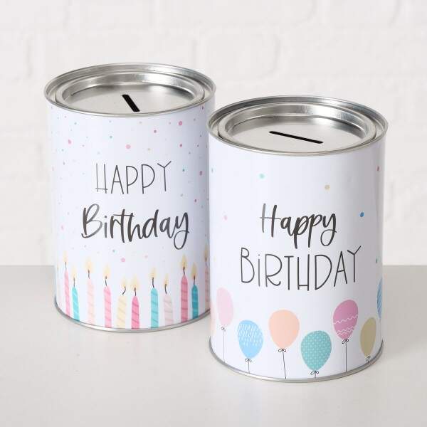 Spardose Happy Birthday, 2 sort., Rund, H 14 cm, D 10 cm, Eisen