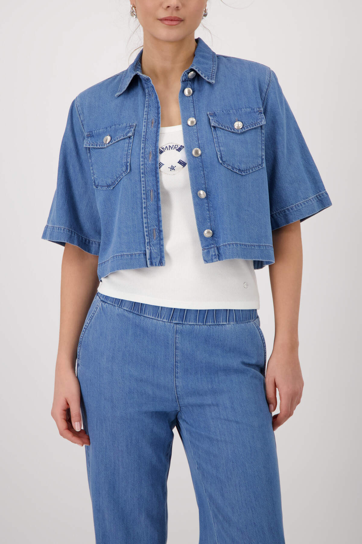 - Shirts und Blusen mit Print, Glanz-Details oder Stickereien